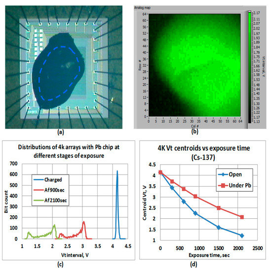 Gamma imaging experiment: (a) the chip with C-Sensor array and a lead grain (the large dark stain is epoxy, and inside the epoxy, one can see the lead particle); (b) sensor bit-map after the exposure (the particle “image” on the bitmap appears mirrored due to columns address scrambling); (c) examples of Vt distributions at different stages of the experiment; (d) Vt distribution peaks in the course of irradiation (with and without lead).