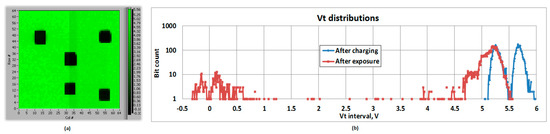 As in the case of Gamma, X-ray and UV irradiations, the array sensors were charged uniformly before the exposure (Figure 16b). The twofold Vt distribution after charging corresponds to two types of cells in array: with and w/o M1 shield above the sensing capacitor (different coupling ratios). Two types of cells were used to evaluate the influence of metal routing over the sensor. After the ion bombardment in a passive mode, the Vt distributions were acquired again (Figure 16b).