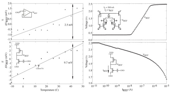 - Seok, M.; Kim, G.; Blaauw, D.; Sylvester, D. A Portable 2-Transistor Picowatt Temperature-Compensated Voltage Reference Operating at 0.5 V. IEEE J. Solid-State Circuits 2012, 47, 2534–2545. [Google Scholar] [CrossRef]
