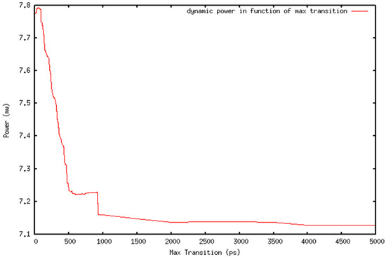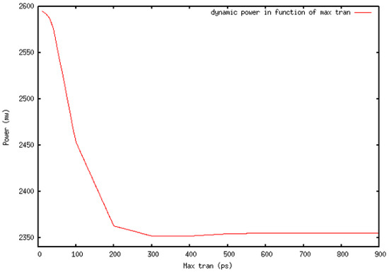In the experiments, we noticed that, by applying MTCs that are too small, we are over-constraining the design. Over-constraining the design forces the optimization engine to reject power improvement solutions due to a max transition-costing violation, which means that, if a solution improves power but violates the MTC, it will be rejected. A large MTC, on the other hand, causes a power increase due to increased short-circuit power, which is a linear function of the transition time. By under-constraining the MTC, we are allowing the design to have large transitions—hence the short circuit power, which is an important component of the dynamic power. Therefore, there is an optimum value in between, which we can find using our algorithm (Algorithm 1).