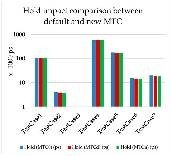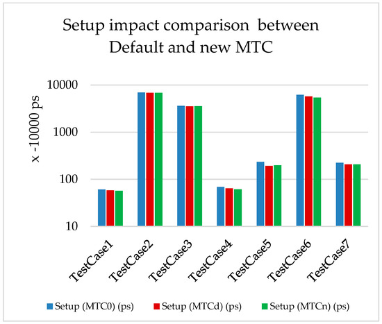We deduced from the results shown in Table 4 and Figure 5 that, with the default MTC, the average power gain is 38.3%, while it reaches 43.3% with the newly generated MTC. Additionally, we noticed that the timing is better in most cases for both setup and hold (Figure 6 and Figure 7).