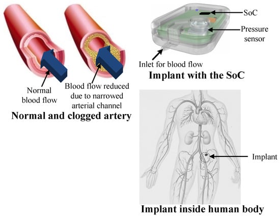 Although the intended application for the SoC is open and can be employed in industrial applications or as a medical implant to measure physiological parameters, such as temperature, ECG or blood pressure. One of the possible applications could be to develop a bioimplant to monitor blood pressure in the femoral arterial system for the patients suffering from Peripheral Artery Disease (PAD). Most of us are aware of arterial blockages in the heart or in the brain; a similar kind of blockage can also occur in places like arteries in the legs. PAD is commonly referred to the arterial blockage of the legs, but it can affect the other arteries (except heart and brain) too. A detailed discussion about the disease is done in the works [19,20]. The work [21] presents in detail the global distribution of the disease based on high-income and low-income countries. As per [21], in 2010 there were 202 million living with the disease, where it also asserts about the occurrence of the disease depending on sex and age of the individual. The idea of the proposed passive implant is to monitor the blood pressure within the blocked artery through invasive method. The particular individual can monitor the arterial condition by using his or her smart device. Figure 1 shows a simplified diagram of the implant realized by using the proposed SoC.