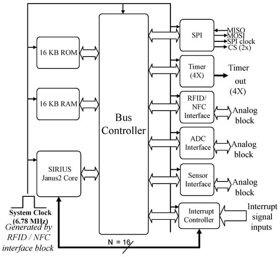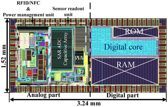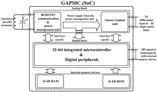 Figure 3 exhibits the internal architecture of the SoC, which consists of analog block, digital block, and internal memory devices. The analog block can be further split into two categories RFID/NFC communication and power management unit and sensor readout unit. The digital block consists of a 32-bit integrated microcontroller and digital peripherals. The internal memory devices include 16 KB RAM and 16 KB ROM.