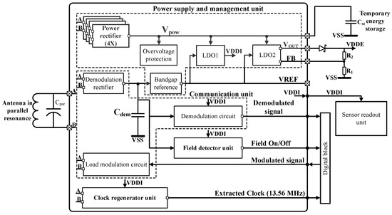 This block is responsible for RFID/NFC communication and also for handling the entire power supply of the chip. Based on the functionalities, this block can be categorized into four different units, such as a power supply management unit, RF communication unit, field detector unit and clock regenerator unit.