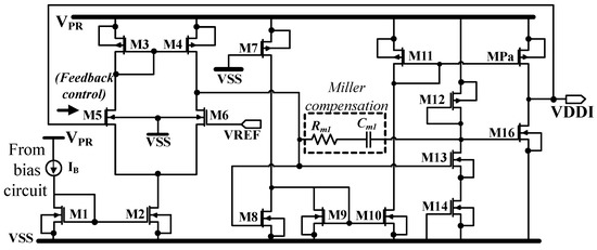 Figure 6 shows the schematic of the LDO1, where M3-6 forms the first stage, M7-11 forms the second (inverting) stage and the pass element MPa is the third stage. The devices M12-14 form a common source stage with source degeneration. This provides the gate voltage for the load device M16, which acts as an active resistor to set the output voltage at . To achieve a good phase margin and stability, a pole splitting capacitor in the form of Miller compensation is provided along with a resistor . Including only would have caused a right half plane zero (RHP), resulting in a stability issue.