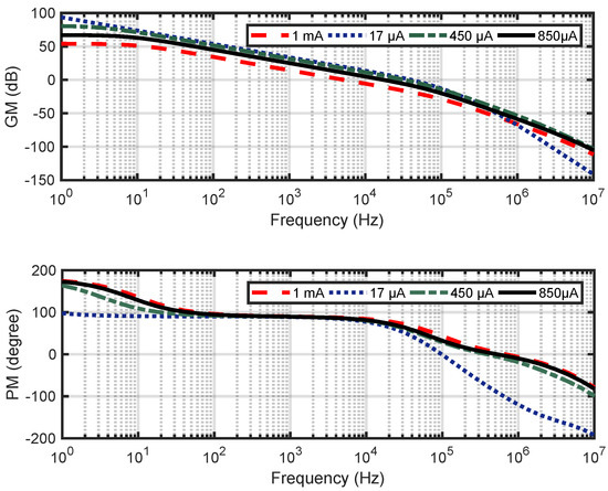 Loop gain parameters for different load conditions for = and at nominal temperature condition of 27 °C.