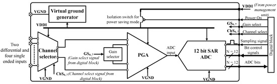 The sensor readout unit is initially proposed in [47,49], which is further modified. Figure 8 shows the system architecture of the sensor readout unit proposed here, which consists of channel selector, virtual ground generator, PGA (programmable gain amplifier) and a 12-bit SAR (successive approximation register) type ADC (analog to digital converter). In the following sections, the design of some of the circuits is discussed in details.