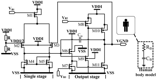 The virtual ground generator fulfills two purposes. Firstly, it provides the reference voltage VGND for the channel selector, PGA and the comparator for the SAR ADC. Secondly, as it is compatible with the human body model, it can be used as the reference potential by the reference electrode for the ECG measurement. Figure 9 shows the simplified circuit diagram of the virtual ground amplifier circuit which is a voltage follower circuit configuration. In the figure, the human body model is characterized by a resistive load = and a capacitive load = , which forms a low pass filter. The output stage of the virtual ground generator shall be able to source and sink current. For this, a PMOS differential amplifier is used as the first stage, which is followed by two common source amplifier stages CS1 and CS2 consisting of PMOS (M6) and NMOS (M9) devices respectively. Both the CS stages provide the voltage headroom close to both the rails for the class AB output stage. Class AB amplifier is ideal to drive larger load capacitances as the push-pull output stage can both sink and source current. M2, M3, M10, and M11 are kept in saturation, M6 and M9 are in weak inversion region. The transconductance () for each of the stages is given as follows: = , for CS1: = and for CS2: = .