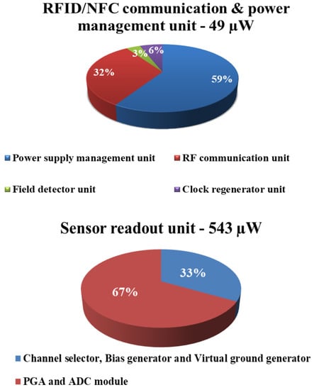 The RFID/NFC communication and power management unit is realized as a stand-alone chip and is tested for full functionality. The power rectifier of the power supply and management unit has a measured power conversion efficiency of 45% (max) for a load of .The communication unit is designed in conformation to the ISO 15693/NFC 5 standard. The overall power consumption of the standalone chip is which is least in comparison to some other state-of-the-art ICs [30,31,32,76,77].
