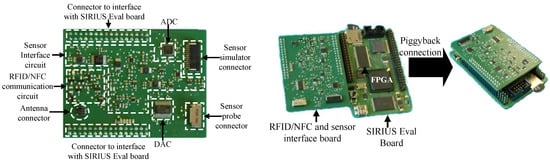 Left hand side: RFID/NFC communication and sensor readout board is shown. Right hand side: The SIRIUS evaluation board together with the interface board.