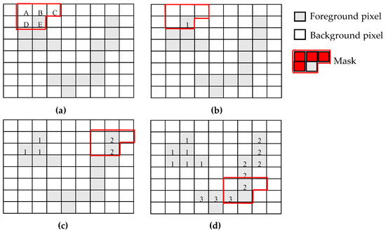 - He, L.; Ren, X.; Gao, Q.; Zhao, X.; Yao, B.; Chao, Y. The connected-component labeling problem: A review of state-of-the-art algorithms. Pattern Recognit. Lett. 2017, 70, 25–43. [Google Scholar] [CrossRef]