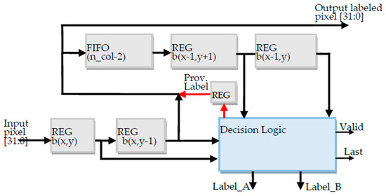 All the custom modules detailed below have been described by means of parametric VHDL codes. The Provisional Labeling circuit illustrated in Figure 3 receives the stream of binary pixels coming from the 32-bit AXIS DMA0 interface; it forms the chosen pixels neighborhood and assigns the provisional label to the current pixel b(x,y). Finally, it merges pixel and label information on the output 32-bit stream. The circuit has been equipped with custom input-output standard AXIS interfaces that are not depicted in Figure 3. A FIFO stage, whose depth is related to the width resolution of the input image, is used to form the pixel’s neighborhood.