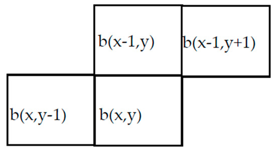 Without loss of generality, we have chosen the neighboring pixels b(x,y − 1), b(x − 1,y + 1) and b(x − 1,y), as shown in Figure 4. When a new pixel enters the pipeline, the chosen neighborhood is transferred to a logic circuit that assigns the provisional label based on the following rules: