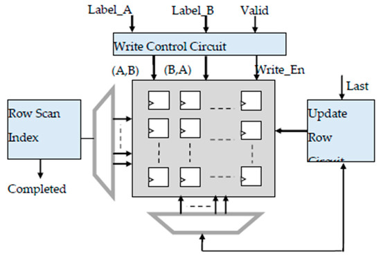 In Figure 5, the schematic diagram of the 2D table sub-system is illustrated. It consists of a Write Control Circuit that receives information to be stored from the previous stage labels. Label_A and Label_B values are used as the coordinates for the access to the 2D table, so that a logic of one is written in the (A,B) and (B,A) positions at the same time. If Label_A = Label_B, a single write operation in a diagonal element is performed to flag that the new label has been assigned to a pixel.
