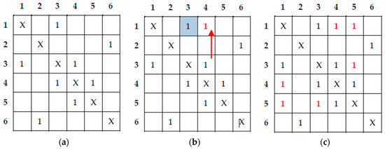 In Figure 6a, an example of such a 2D table sub-system is reported. We suppose that six labels have been assigned, thus, all elements on the diagonal line were written with a logic of one. Since such elements do not play a role in the subsequent phase, in which collisions are resolved, we filled those positions with ‘X’. Furthermore, several collisions were identified during the provisional labeling step and consequently other positions in the table were filled with a logic of one. The collisions in the example of Figure 6a are (1-3), (3-4), (2-6), and (4-5); no matter the order in which they were found. It is worth noting that a collision chain is present (1-3, 3-4, 4-5).