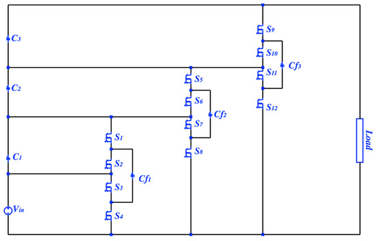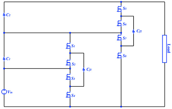 However, the SC converters are not ideal or without drawbacks. For instance, providing a higher voltage gain is unlikely to be achieved with SC converters. Furthermore, the SC converters cannot normalize the output voltage in a lossless approach due to the resistors [5,6,7,8]. The proposed step-up PSC converter has demonstrated a higher gain voltage at a smaller number of elements compared to other SC topologies. The PSC converter has a gain voltage where is the number of stages. Each added stage requires two additional capacitors and four more switches [7]. Unlike the other SC converters’ topologies, the number of operation modes increase with the number of levels. Each level of the PSC converter has two operation modes. For instance, the 1-to-4 PSC converter (two-levels) as in Figure 1 operates in four operation modes, where three-levels operate in six operation modes. To achieve a superior efficiency achievement purpose, it is recommended that SC converters are designed with resonant soft-switching techniques. However, designing resonant SC converters requires additional components, and hence a reduction in the power density is possible [9,10,11,12,13,14,15,16,17].