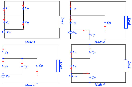 Figure 1 shows the topology of the 1-to-4 PSC converter and its control signals [7]. The control diagram in Figure 2a shows how four modes of operation are possible. The operation modes come in the following sequence: Mode-1, Mode-2, Mode-3, Mode-4, and Mode-1. In each mode, the capacitors are connected differently for voltage regulation purposes. In Mode-1 the flying capacitor is charging; however, flying capacitor is discharging. In Mode-2, both flying capacitors and are discharging, whereas they are both charging in Mode-4. In Mode-3 is discharging whereas is charging. To find the voltage gain of the proposed converter, each mode has a total charge that can be derived from the following equations.