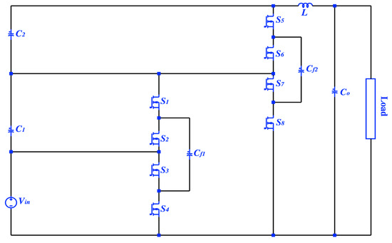 DC-to-DC converters are commonly designed with magnetic elements for energy storing purposes. Designing a DC-to-DC converter with magnetic components such as an inductor leads to low power density due to the inductor bulky size. An increase in the power density of DC-to-DC converters requires a higher switching frequency () since the inductor size is inversely proportionate to the switching frequency. Increasing the can solve the problem partially; however, it will cause a switching loss produced by semiconductor elements. A growth in switching loss is conversely proportional to the converter efficiency [1,2]. High power density and high efficiency are two significant requirements for designing a DC-to-DC converter functional for tiny electronic circuit integration.