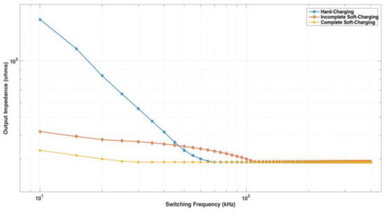 Simulation output impedance of the 1-to-4 PSC converter vs. the switching frequency at three charging methods: hard-charging, incomplete soft-charging, complete soft-charging II.