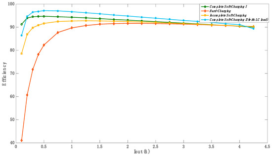 The PSC converter efficiency vs. the rated power at different operation techniques: hard-charging, incomplete soft-charging, complete soft-charging I and complete soft-charging II (with LC filter).