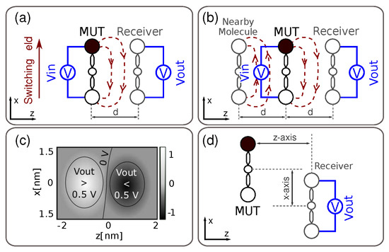 In order to understand the information propagation, the values reported in Figure 11a,c should also be analyzed. In particular, in the case of a positive input voltage applied to the MUT (e.g., in the case of Figure 11a, for V) we assume that the MUT encodes a Logic ‘1’. If the Receiver is aligned with the molecule (X = 0 nm) a negative output voltage can be detected. This leads the Receiver in a state opposite to the MUT one (i.e., Logic ‘0’).