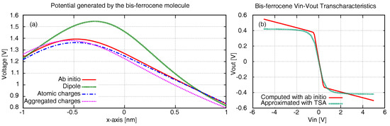 Bis-ferrocene molecule analysis. (a) Comparison of the potential generated by a bis-ferrocene molecule computed using: molecular dipole moment, atomic charges and the proposed Aggregated Charge. The potential is evaluated on a segment parallel to the active segment connecting the two ferrocenes at a distance of 1 nm (typical Receiver position). In the potential calculation that uses the dipole, an additive term equal to is inserted to consider the oxidation of the molecule; (b) Comparison in the Vin–Vout Transcharacteristics evaluated using the Two-State Approximation (TSA) theory and computed with ab initio.