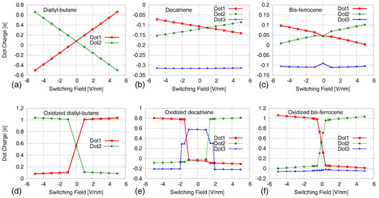 Figure 5a–c shows the VACT of the three molecules, i.e., diallyl-butane, decatriene and bis-ferrocene respectively, in the neutral form (Results are partially elaborated from a previous version in [28,33] where only the Aggregated Charge was presented). The figures report the AC associated to the active dots as a function of the switching electric field which is applied to the MUT. For all the three molecules, the charge separation between active dots appears to increase as the absolute value of the electric field increases. Even with a small value of the field, it is possible to appreciate a charge separation.