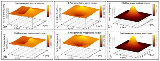 We calculate the electric field using all the atomic charges of the molecule (Figure 6a–c) and using the aggregated charges (Figure 6d–f). A comparison of the fields generated using the two methods (atomic charges and Aggregated Charges), in all the spatial components, reveals that the electric field generated by the two systems of charges are very similar. This allows us to assess that the AC we defined and used to model the molecule is a valid figure of merit. Moreover, modeling the molecules with the Aggregated Charges (the dot charges) does not lead to a lack of accuracy in our results.