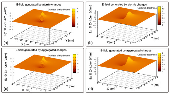 This is confirmed by the results obtained comparing the electric fields generated by the diallyl-butane molecule and the decatriene molecule, computed firstly basing on all the atomic charges and then on the Aggregated Charges and reported in Figure 7. In these cases, we report only the component parallel to the working dot axis, which is the most important and interesting for our analysis.