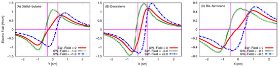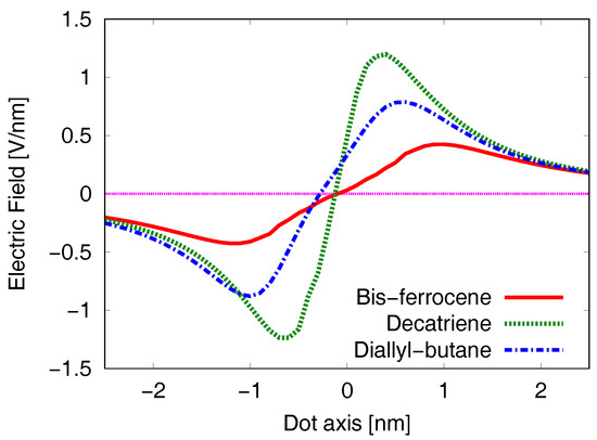 The previous analysis gives an idea of the electric field behavior in the whole 3D space around the MUT. It is now worth to evaluate the effects of the field on the Receiver. For this reason, it is necessary to cut the surfaces of Figure 6 and Figure 7 along the axis where the active dots of the Receiver stand. This means fixing the position of the Receiver on the Z-axis (see the coordinate system in Figure 2d) and considering the axis along the direction where the active dots of both the MUT and the Receiver stand (Y-axis for the diallyl-butane, X-axis for both the decatriene and the bis-ferrocene).