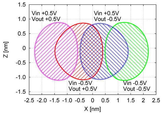 On the contrary, when V the MUT encodes a Logic ‘0’ (Figure 11c). If the Receiver is perfectly aligned with respect to the MUT, it experiences a positive Vout, encoding Logic ‘1’. From the Figure 11a,c, it is also evident that the positive and the negative areas (enclosed by the isopotential curves V and V, respectively) are shifted symmetrically with respect to the center of the molecule (placed at the origin of the axes): in particular, a left shift occurs for positive input voltage whereas a right shift occurs for negative input voltage, respectively. The symmetry of the VOMs increases the effectiveness of the QCA element when the real molecular arrangement is analyzed.