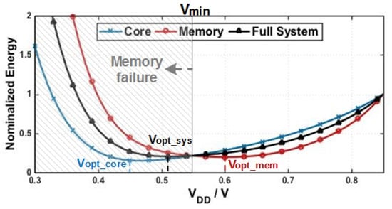 Another critical issue that limits NTC from achieving the optimal energy efficiency is its degraded reliability. Compared to the super-threshold operation at the nominal supply voltage, near-threshold operation is more susceptible to process variation [,], supply noise [], and temperature fluctuations [] (PVT), especially for the memory blocks in NTC, due to their minimum-sized devices and large array numbers. As indicated in Figure 1, the minimum voltage that allows reliable memory operation () could exceed and often dictates the actual supply voltage [,], pushing the NTC system further away from its optimal efficiency point.