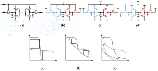 To evaluate the reliability property of 6T SRAM cell under low supply voltages, we first look at its static noise margin (SNM) as a function of supply. The SNM criteria are widely used to characterize the static stability of SRAM cells. The static noise margins for hold (HSNM), read (RSNM), and write (WSNM) can be obtained by overlapping the voltage transfer curves (VTC) of the cross-coupled inverters within a cell, often called the butterfly curve []. The test circuits to measure these SNM metrics are shown in Figure 2b–d, where the cross-coupled feedback loop is intentionally broken to simulate different biasing conditions during hold, read, and write operations. The resulting butterfly curves are conceptually illustrated in Figure 2e–g. The noise margins are extracted from the butterfly curve as the diagonal distance of the biggest square that can fit inside the butterfly curve. We can analyze the shapes of the butterfly curves. For example, during the read operation, and are pre-charged to , which pull the VTC higher and cause it to move slowly to the bit-0 low voltage level as in Figure 2f for read, compared to the curves in Figure 2e for hold. Similarly, during write, one side of the bitlines is driven to ground, the other to . As a result, one of the VTCs corresponding to the ground side switches to low voltage level sharply, as shown in Figure 2g.