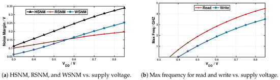 To obtain a quantitative measurement of the SNMs across a wide supply range, we sweep the supply voltage from 0.3 V to 0.85 V, the nominal supply voltage of the 16 nm predictive technology model (PTM) using customized sizing configuration. Figure 3a presents the different noise margins as a function of the supply voltage. Interestingly, read stability and write stability show opposite behaviors at different end of the voltage spectrum: when the supply voltage is high, WSNM is higher than the RSNM, while, at lower supply voltage, the roles are flipped with RSNM being higher than WSNM. Our results corroborate with previous work on write margin analysis [], and hence we hypothesize that write operation fails earlier than read when we lower the supply voltage. Figure 3b shows that read operation indeed outlasts write, and it is possible to reliably read from the SRAM cell at near-threshold voltages where write would have already failed. Hence, if we could switch power supply to a lower voltage for SRAM read operation, a significant power will be saved while maintaining reliable operation. Similar results for different voltages for read and write SRAM reliability have also been observed experimentally in 14 nm devices [], where read failure rate is reported to be lower and so is its minimum error-free voltage.