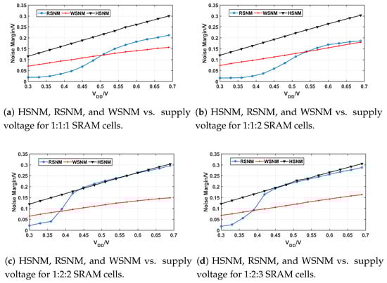 Additionally, we validate the PG, PU, PD transistor sizing impact on static reliability characteristic for SRAM cells in deeply scaled technology, 7 nm ASAP PDK []. We sweep the supply voltage from 0.3 V to 0.7 V with several popular standardized SRAM cell ratios. The SRAMs implemented in our test have the fin-ratios (PU:PG:PD) of 1:1:1, 1:1:2, 1:2:2 and 1:2:3. With the variance of fin-ratios, the static noise margins change as shown in Figure 4a–d. The RSNM and WSNM will always flip while in the different voltage domain. Interestingly, as the PG ratio increasing, the intersection between RSNM and WSNM moves to sub-threshold voltage domain and the upper side of it approaches to RSNM. Associated with above discussion, the 1:1:1 and 1:1:2 SRAM cells in 7 nm process may retain the similar static reliability property and supply voltage demands for read and write separately. In conclusion, we believe this asymmetric reliability property could open new opportunities to improve energy efficiency of NTC processors even in high-end deeply scaled technology process.