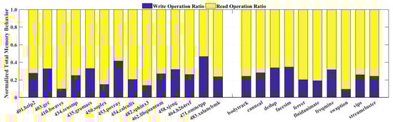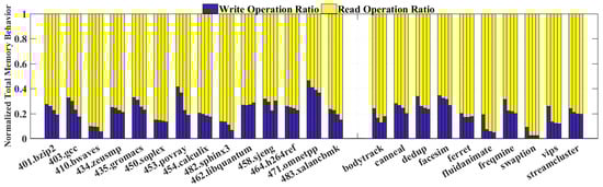 Read and write operations ratio distribution among cache traces of different SPEC2006 and PARSEC benchmarks.