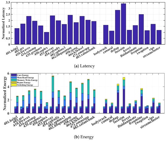 Let us first evaluate a naive approach of greedy switching—the memory supply is set to mV whenever there is a read transaction and to mV whenever there is a write transaction. We pick these voltage levels because is close to in this technology process, and is the nominal supply voltage. We use the NTC configuration with a single supply voltage at mV as the baseline case for comparison. We use the transition delay numbers from previously published dual-supply architecture for our estimation []. Figure 6a reveals that execution latency can rise significantly due to the additional transition time of the supply switching. The latency increase can be as much as 60–70% for most SPEC2006 and PARSEC benchmarks. In addition to the latency penalty, Figure 6b indicates that naive greedy switching results in significant energy overheads on top of the normal energy consumption broken down for core, memory read, and memory write.