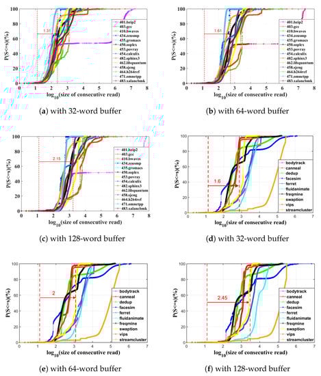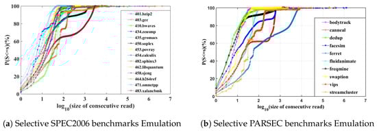 Using the definition in Equation (1), we can plot the CDFs of consecutive read sequences generated by executing different SPEC2006 and PARSEC benchmarks, as shown in Figure 7a,b. If we look at three characteristic points where the CDF crosses 20%, 50%, and 80% probability, we find that the greater the value of the horizontal axis corresponding to these percentages, the higher LCRSP the benchmark has according to its cache trace. For example, in 483.xalancbmk, these three CDF characteristic points are approximately = 18.718%, = 50.353% and = 79.99%, which means 79.99% of the trace has a consecutive read size of or smaller. It suggests that 483.xalancbmk has many long consecutive read sequences, therefore is a good candidate for dual-supply switching. Conversely, similar measure would suggest that the cache trace of 435.gromacs’s has a poor portion of long reads, aggressively switch the dual-supply power will bring unexpected cost. Figure 7a,b indicates SPEC2006 and PARSEC benchmarks are diverse and the opportunity to save energy is unevenly distributed. Interestingly, we note that PARSEC benchmarks generally show higher potential thanks to the longer consecutive read sequences in PARSEC’s data-intensive workloads.