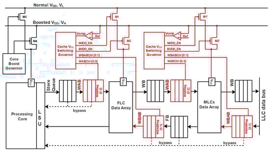 The micro-architecture structure of our proposed WAB and WBAB is based on write buffer [] design used in cache architecture of conventional CPU systems such as Intel Xeon and AMD64. In conventional processor, a write buffer can hold the data temporarily and stop it being written from the higher-level cache (for write backward) or to the next-level cache or the main memory (for write forward). It allows the lower-level cache to service the subsequent read requests without waiting for long write transactions to complete at slow main memory. We enhance the conventional write buffer design with aggregation functionality to accumulate write transactions together to a specific length and release multiple write requests to the global cache access sequence all at once. During the WAB releasing period, read transactions still have higher priority. When a read request is issued to the global access sequence, the write release operation at the WAB would halt and wait for reads to be completed. Actually, this policy increases the duration of write-level power switch-on, but reduces the supply switching activities in disguise. Additionally, to guarantee the reliability of WAB/WBAB access, the supply voltage of WAB/WBAB is connected to .