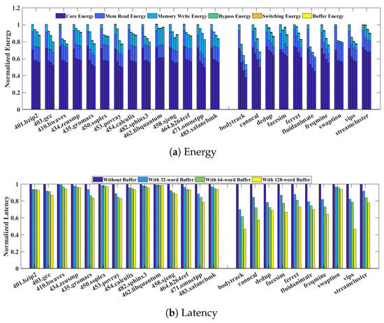 Using the NTC processor of the same configuration with only a single fixed supply voltage at mV as our baseline example for comparison, we evaluated the energy efficiency of our proposed dual-supply switching technique. Compared to the NTC baseline, we improved the energy efficiency by implementing the WAB and WBAB with dual-supply in the system. Actually, the WAB and WBAB structures with bypass mechanism can reduce the total read and write cache access time and respond to the read requests from bypass instead. As bypass could be accessed faster and consume much less energy, which provides us with large energy and latency benefits. In Figure 12a, we get the nominalized energy for NTC, without WAB/WBAB and with 32-word, 64-word, and 128-word buffers, from left to right. We could conclude that aggregating write by WAB and WBAB with dual-supply will bring a considerable energy efficiency improvement. Although there is still some energy overhead due the additional combinational logics, buffers and bypass, it is negligibly small compared with the dominant core and memory energy consumption. By averaging the nominalized energy, we get approximately 21.45% energy saving.