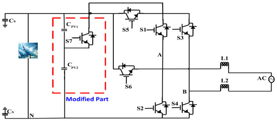 Many transformerless inverter topologies with unipolar modulation technique have been introduced to increase system efficiency and reduce the leakage current by disconnecting the AC and DC sides during the freewheeling modes; this is known as galvanic isolation. Many topologies have been derived and developed based on this method, including a highly efficient and reliable inverter concept (HERIC), the H5 inverter and the H6 topology [12,13]. However, complete elimination of leakage current cannot be achieved with the galvanic isolation method alone because common mode voltage (CMV) during freewheeling periods cannot be identified by the switching state, which means that it is not constant. Therefore, modulation strategies and converter structures must be modified so that CMV becomes constant during all inverter operating modes.