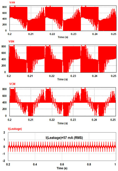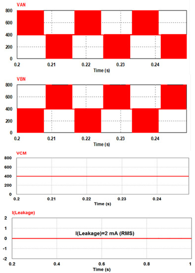 It is observed that the voltage waveforms of and are oscillating. Furthermore, the common mode voltage is oscillating and not constant at 400 V. Therefore, there is a flow of leakage current that cannot be eliminated. To resolve this problem, the proposed topology is modified with a clamping method and the CM characteristics, such as , , and leakage, that are shown in Figure 11. It is also noted that the voltage waveforms of and are smooth and complementary to each other. As a result, the is totally clamped to 400 V over the whole period, which will lead to a total elimination of leakage current.