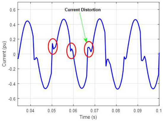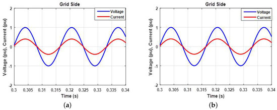 Figure 13 shows a current distortion in the negative power region because there is no current path to realize a zero-voltage through the negative power region. However, the issue of current distortion with conventional unipolar PWM can be resolved with the proposed unipolar PWM. The proposed modulation technique works optimally with a lagging or leading power factor where the simulated waveform has free current distortion as depicted in Figure 14. Hence, the proposed modulation technique supports the proposed H6 inverter for reactive power generation.