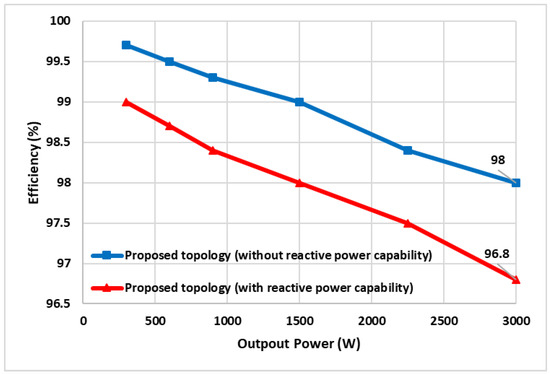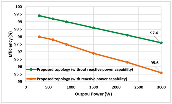 It is noted that the proposed topology with the modified modulation method succeeded in handling reactive power with 3.15% THD, as shown in Figure 15. However, the proposed topology incorporating the conventional modulation method generates high THD that does not comply with the IEEE 1547 Standard (THD < 5%) due to the absence of current path in the negative power region. The THD is reduced by 82% with the modified modulation. The efficiency of the proposed topology with and without reactive power capability is measured with SiC MOSFET switching devices. The efficiency is determined according to the California Energy Commission (CEC), as shown in the following: