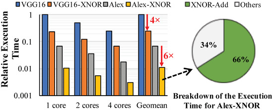 Sensor equipped Internet of Things (IoT) devices are expected to impact the future of consumer electronics. According to a recent prediction of ABI research [1] and IDC forecast [2], by the end of this decade, approximately 480 million IoT wearable devices will be sold.Detecting different human behaviors and ambient contexts and producing appropriate reaction are the core application of any mobile IoT device. Deep learning has emerged as one of the key techniques to enable many IoT mobile applications—extracting sensor data, identifying meaningful context, and performing intelligent tasks such as face detection [3], image classification [4], and speech recognition [5,6]. However, the increased demand of computation, memory, and energy consumption creates serious challenges to its applicability in IoT mobile devices. Recent studies have shown that the memory requirements of neural networks can be reduced by applying various compression and quantization techniques [7,8]. It has been observed that full precision value of weights or inputs is not required to get state-of-the-art accuracy from various deep neural networks. For example, binary neural network [9] and XNOR-Net [10] replace the power consuming floating point multiplications with bitwise XNOR operations. As shown in Figure 1, one bit quantization helps to achieve significant performance improvements for state-of-the-art neural networks. In addition, energy consumption and memory footprint are significantly reduced. However, simulation results indicate that of the total execution time in Alex XNOR-Net inference is dedicated to XNOR convolution. The number further increases for a bigger network such as VGG16-net.
