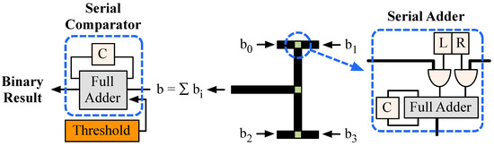 Every bank comprises a controller, an H-tree based reduction network, and a set of data arrays. The bank controller includes: (1) local memory for buffering the computed bit-count results; and (2) full adders and comparators for computing the final sum and quantizing the final result into a binary value. During an XNOR convolution, partial bit-counts are computed by the memory arrays and merged into a single bit-count when transferred over the reduction tree to the bank controller. Figure 11 shows how partial bit-counts are merged in the reduction tree. Every node employs a serial adder element to add two single-bit operands and store the carry bit locally. The serial addition allows for low cost and energy-efficient computation in the reduction tree. Similarly, at the bank controller, a serial adder is used to compute the difference between the final bit-count and the quantization threshold (). The two’s complement format of the threshold is used to compute the subtraction using the serial adder circuit, thereby realizing a serial comparator.The last bit to be computed by the serial comparator represents the sign in two’s complement format that indicates whether the result is negative () or positive (). The inverted version of this bit represents the binary result.