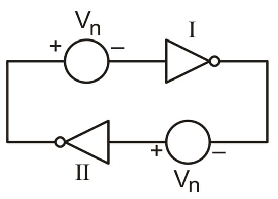 Flip flop comprising two inverters (I and II); static noise voltage sources (Vn) are included.