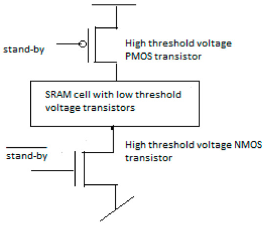Multi-threshold CMOS (MTCMOS) SRAM cell.