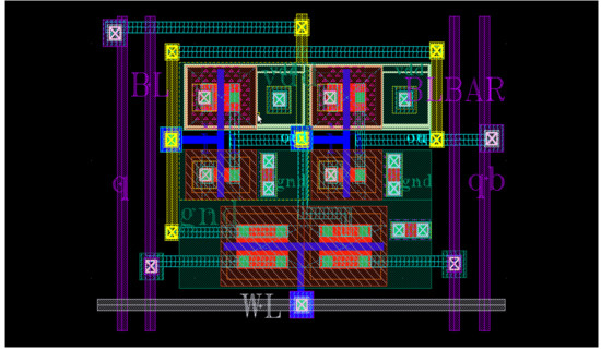 Then the proposed SRAM cell as shown in Figure 10 is designed and simulated for SNM and leakage calculation. The layout of the same is also generated to look into area overhead. The proposed cell was simulated to calculate the read static noise margin (RSNM) and the write static noise margin (WSNM). The read static noise margin (RSNM) is a measure of how much noise voltage is required at the node storing “0” to flip the state of an SRAM cell while reading. Therefore, RSNM is a more critical design metric of SRAM cells than SNM. The write static noise margin (WSNM) is another SRAM cell design metric, which implies the write ability of an SRAM cell. It is a measure of the ability of the cell to pull down the node storing “1” to a voltage less than the switching threshold voltage of the other inverter storing “0”, so that flipping of the cell state occurs. WSNM is measured while writing “1”. The layout of a proposed SRAM cell that uses an NMOS access transistor with two fingers is designed and shown in Figure 13. The leakage current, RSNM and WSNM were also obtained for the proposed cell. All design and simulation was done using the Cadence Virtuoso tool at 55 nm UMC technology. The results obtained for the proposed cell are compared to the SRAM cell mentioned in [27,28,29]. The comparative analysis of different parameters is given in Table 2.