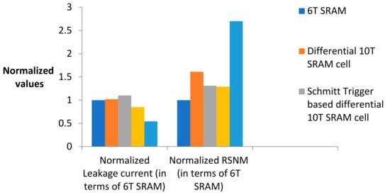 Comparison of leakage current and RSNM (normalized in terms of 6T SRAM cell).